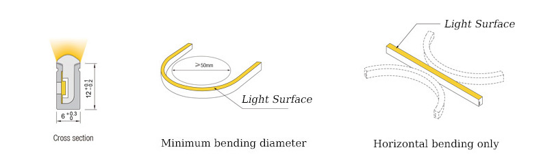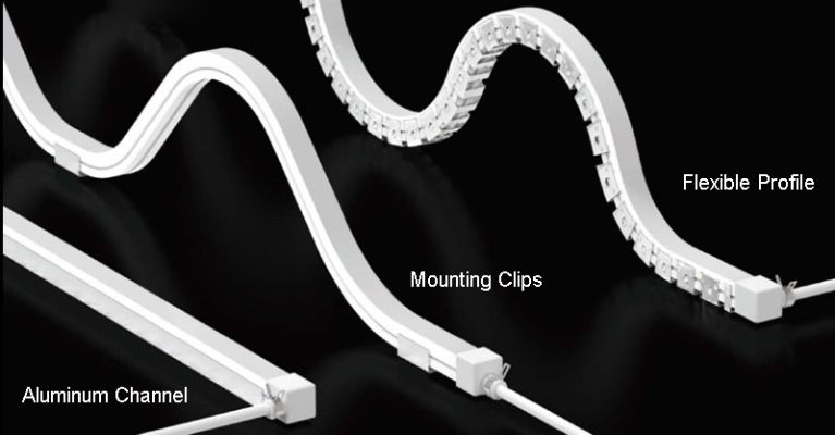 There are three installation methods for the led neon strip lights. One is to install with mounting clips (purchase separately). The second is to put the flex led neon tube light into the aluminum channel for linear lighting projects. And the third is to use flexible profiles for curved path lighting, which has great bending freedom.