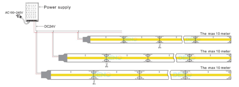Choose the switching power supply size according to the actual number of connected strip lights and reserve a 20% margin to avoid power supply damage.